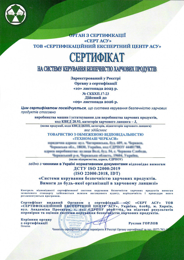 Відомий виробник сільськогосподарського обладнання компанія ТехноМашСтрой пройшла процедуру сертифікації. Відтепер вся продукція має відповідний український («УкрСЕПРО») та європейський («СЕ») сертифікат відповідності. Також виробництво впровадило та використовує систему управління якістю стосовно сфери діяльності стандарт ISO 9001